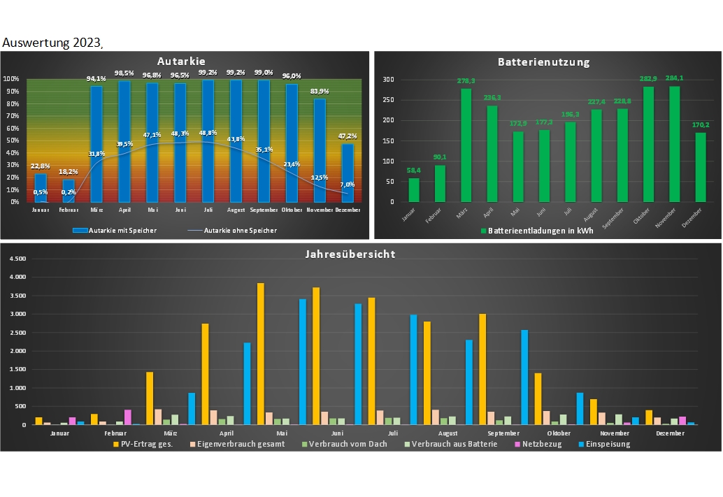 - Formel im Blatt Auswertung zur Ladezyklenberechnung angepasst von „Speicherladung / Speicherkapazität“ zu „Speicherladung / (Speicherkapazität * (maxSOC – minSOC))“ um so statt der Brutto-, die Netto- oder auch Nutzkapazität zu berücksichtigen. Es ergeben sich damit je nach Nutzkapazität des Speichers andere Werte für die Anzahl der Ladezyklen.